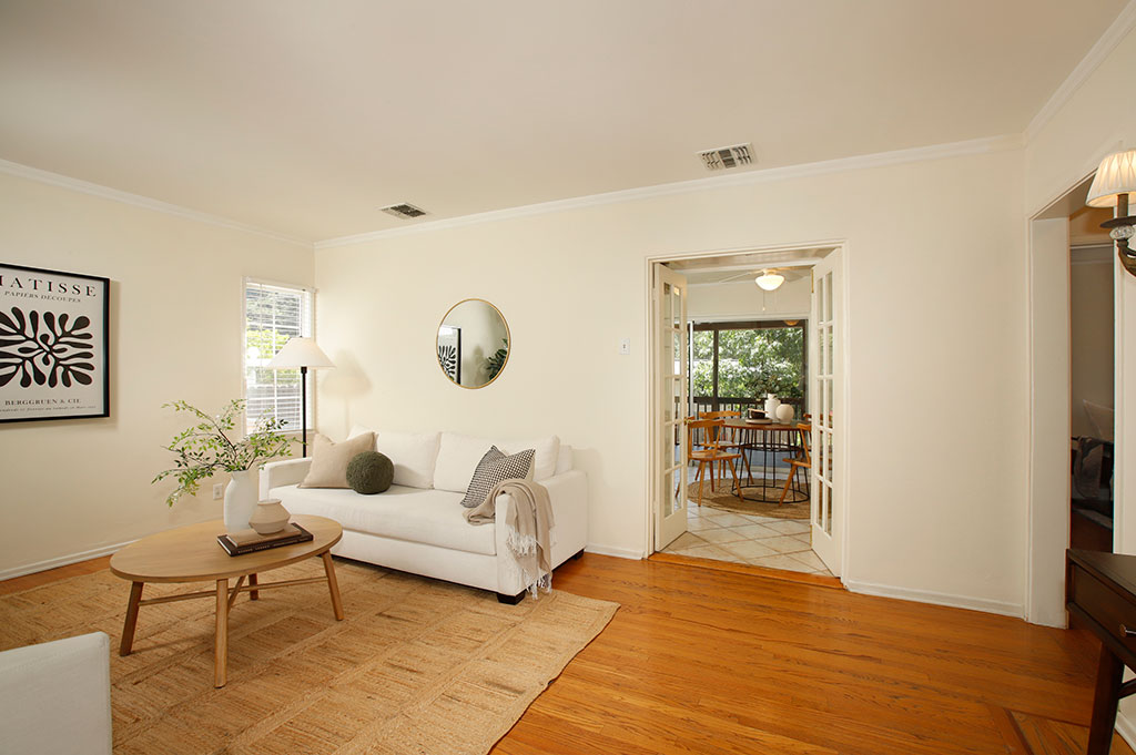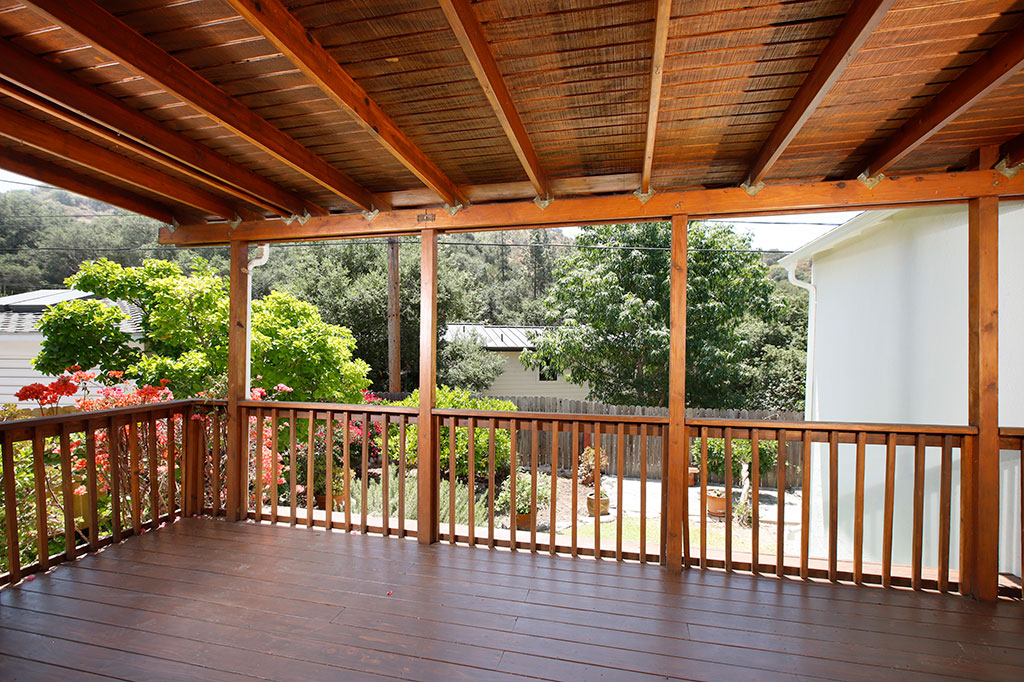 Greeted at the front door within a welcoming front porch, you are invited into the formal living room with its rich hardwood floors and character wood windows that fill the home with natural light. The oversized kitchen is a wonderful surprise with its updated tile flooring, granite counter tops, and a wall of glass overlooking the romantic covered patio and the view beyond. Both bedrooms are off the main hall with a den in the middle that could function as a third bedroom as well. The full bath has been tastefully updated and the primary bedroom has its own primary bath.