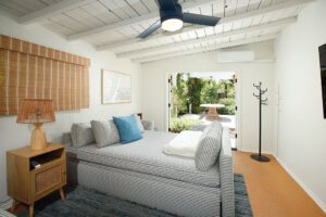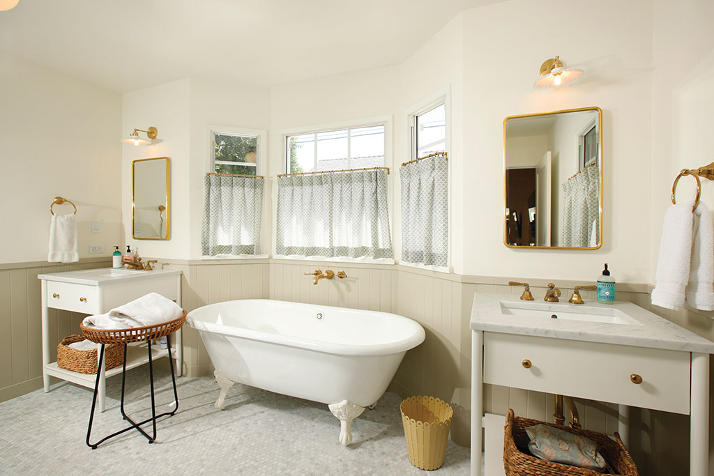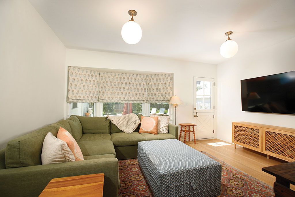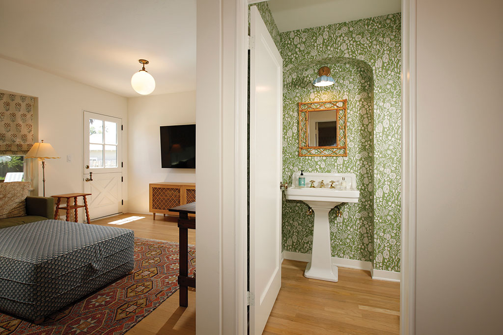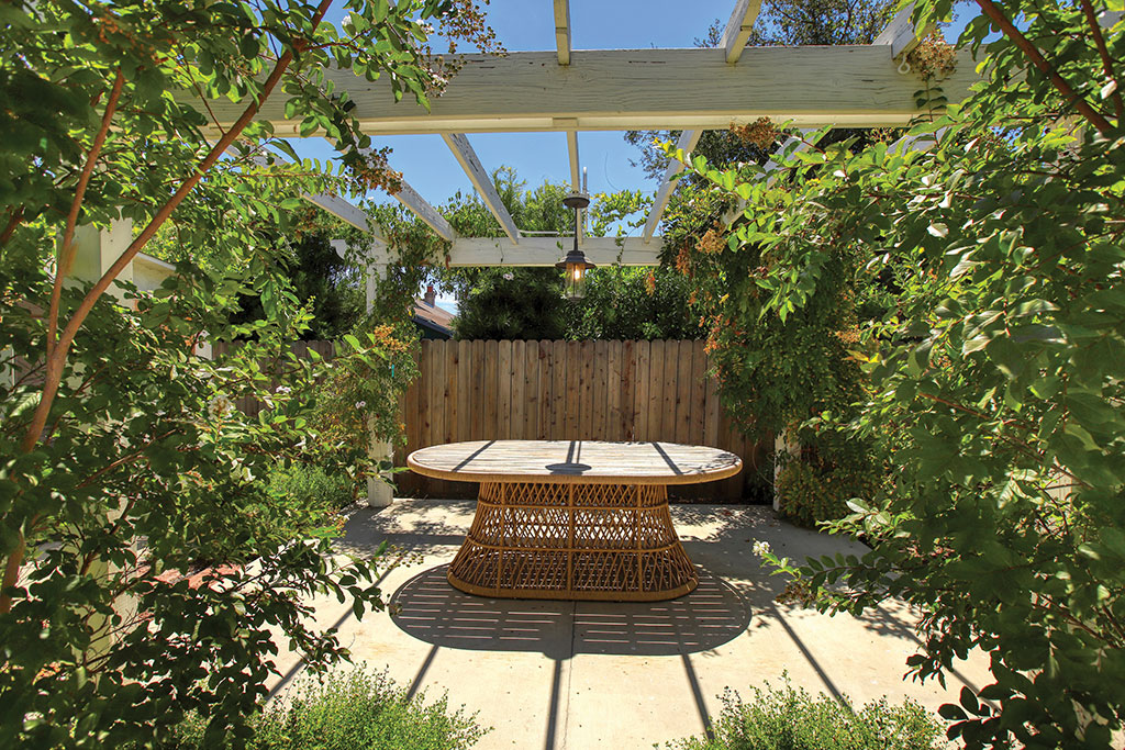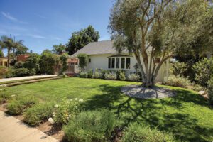 The formal entry opens into the living room which includes wicker light fixtures, built-in bookcases, a fireplace, and a large bay window with views of the San Gabriels. The dining room has a set of French doors, multiple windows, and a beautiful light fixture. The kitchen is one of the homes’ highlights with the Wolfe range as its centerpiece. Open upper cabinets, custom lower cabinets, gold plated fixtures, tiled backsplash, and stainless appliances finish off the space. Off the central hallway are the three bedrooms, powder room, and family room. The front and rear bedrooms include spacious closets, wall sconces, and large windows. The Jack-and-Jill bathroom offers dual vanities, black fixtures, and a bathtub. The primary bedroom offers a nicely sized closet and its own bathroom featuring a clawfoot tub, two sinks, spacious shower, and tiled flooring. At the end of the hallway is the family room and access to the rear yard through the Dutch door.