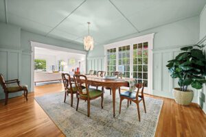 The formal dining room, with its handsome built-in buffet cabinet, wainscoting, and wall of French doors that beckon to the side garden, leads to the bright kitchen, featuring butcher block countertops, cheerful vinyl flooring, a vintage stove, stainless steel appliances, and a walk-in pantry. A charming sitting room, laundry room, and half bathroom complete the spacious first floor.