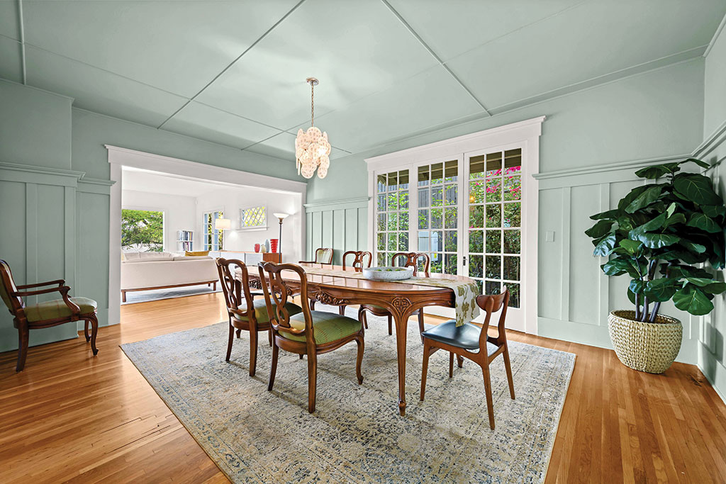 Above street level and beyond a river rock border, the classic SoCal citrus-farm-inspired front garden features fruit trees and drought-tolerant shrubs. Rich character details abound in the dramatic contours of the light-filled living room, boasting high ceilings, casement windows, original oak flooring, built-ins, and an impressive, oversized picture window that exquisitely frames the verdant view.