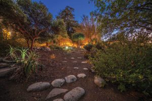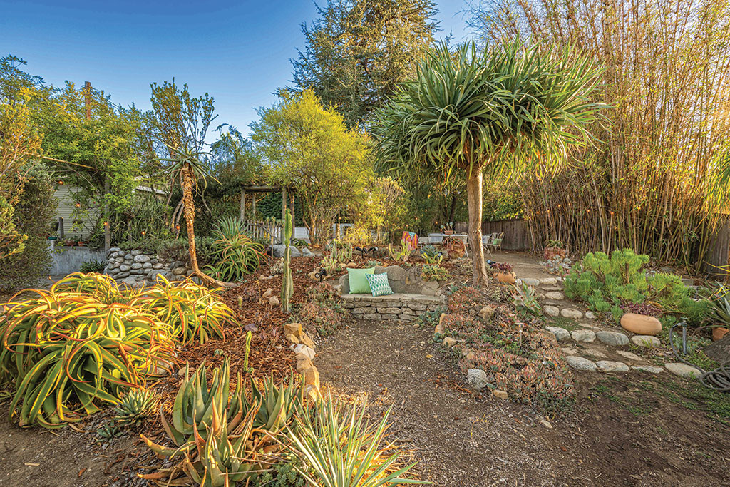 The split-level back patio leads the way to the private, massive, Dr Seuss-themed side yard focused on plants with dramatic, whimsical structures and a menagerie of fruit trees (orange, tangerine, lime, lemon, apricot, persimmon, loquat, a large white sapote, young apple, and two different varieties of pomegranate!) Featuring a towering dracaena draco, Australian and South African native shrubs, long river rock planter ideal for an herb garden, multiple entertaining areas, flat play yard, and not another home in sight, this yard is made for fresh cut blooms, views, and star gazing.